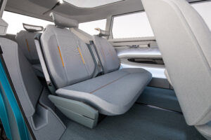 העיצוב המיוחד (ואפילו מדהים יש לומר) נמשך גם אל תוך תא הנוסעים – שם נמצא שלוש שורות מושבים, גג זכוכית פנורמי וקונסולה "מרחפת" עם מסך תצוגה ארוך בגודל 27 אינטש ויש גם ריפודי עור ויגן פרנדלי לאלו מאיתנו שמקפידים.
